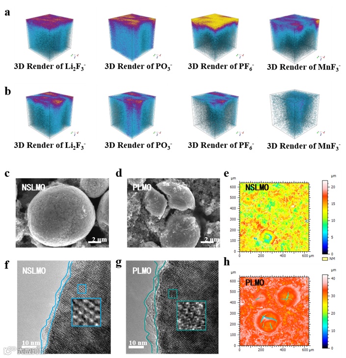 循环后的电极形貌对比:未改性的LMO颗粒在经过200次循环后,表面布满了龟裂;而披覆了玻璃陶瓷的NSLMO颗粒,则依然保持着完好的球形,仅有少量缺陷。高分辨透射电镜TEM进一步揭示,NSLMO表面形成了一层薄而致密的CEI膜,内部层状结构清晰可见;而对比样则出现了严重的非晶化和岩盐相退化。
