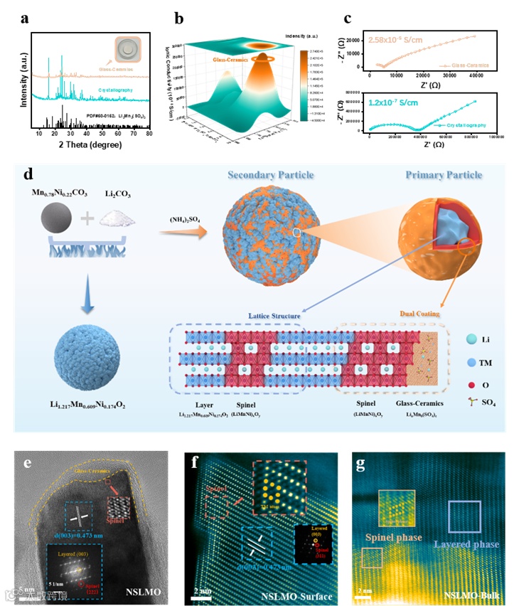 研究团队通过控制硫酸铵的用量和处理温度,在LMO正极颗粒表面原位生成了一层独特的 Li₂Mn₂(SO₄)₃玻璃陶瓷,LMS-GC。这层保护层具有双重保护机制: