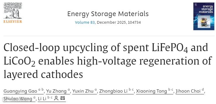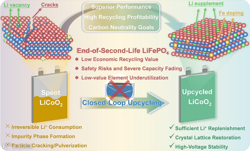 近日,东北大学李犁教授团队在能源材料领域国际权威期刊《Energy Storage Materials》上发表最新研究成果,提出了一种基于“以废治废”理念的闭环升级再生(Closed-loop Upcycling)策略,实现了对失效钴酸锂(LiCoO2)正极材料的高性能再生。该策略以二次寿命终止的磷酸铁锂(LiFePO4)正极为资源,通过低成本化学浸出与一步固相烧结过程,同时完成锂离子补充、结构修复及Fe掺杂三重调控,使低价值LiFePO4废物成为高价值LiCoO2再生的关键功能来源。得益于该策略精准的化学计量补偿、晶格重构以及高效掺杂调控,升级再生后的Fe掺杂LiCoO2在4.5 V高电压展现出优异而稳定的电化学性能,优于商业LiCoO2材料及多数现有再生策略。本研究为多组分锂离子电池正极材料的协同回收与高值化再生提供了全新的技术路径。