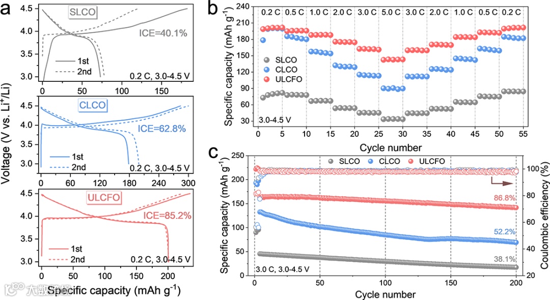在此背景下,本研究团队提出了一种闭环升级再生策略。以失效LiCoO2材料为主体,以二次寿命终止的LiFePO4作为补锂剂与掺杂剂来源。通过对LiFePO4浸出获得的Li2CO3与Fe(OH)3进行组合调控,在一步固相烧结过程中同步完成失效LiCoO2内部的锂离子补充、晶格修复与Fe掺杂。其中,Li2CO3作为锂源有效补充了D–LCO中的锂空位,解决了长期循环后普遍存在的锂亏损问题;Fe(OH)3在高温下实现均匀掺杂,在保持原有层状结构的前提下增强结构稳定性,抑制高电压下的H2-M1-H3相变,提升了再生材料的结构稳定性。得益于上述结构调控,再生的Li2CO3材料在0.2 C倍率下放电容量达201 mAh g−1,在3 C倍率下循环200次后容量保持率仍达86.8%。技术经济评估表明,本策略在能耗、水耗、温室气体排放及经济收益方面均优于现有主流回收方法,展现出良好的工业前景与可持续发展潜力。