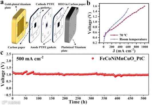 图5. a) 混合海水电解槽的示意图。 b) 在室温和70 °C下记录的极化曲线。 c) 在70 °C下以500 mA cm−2的电流密度评估电解槽的长期运行稳定性。