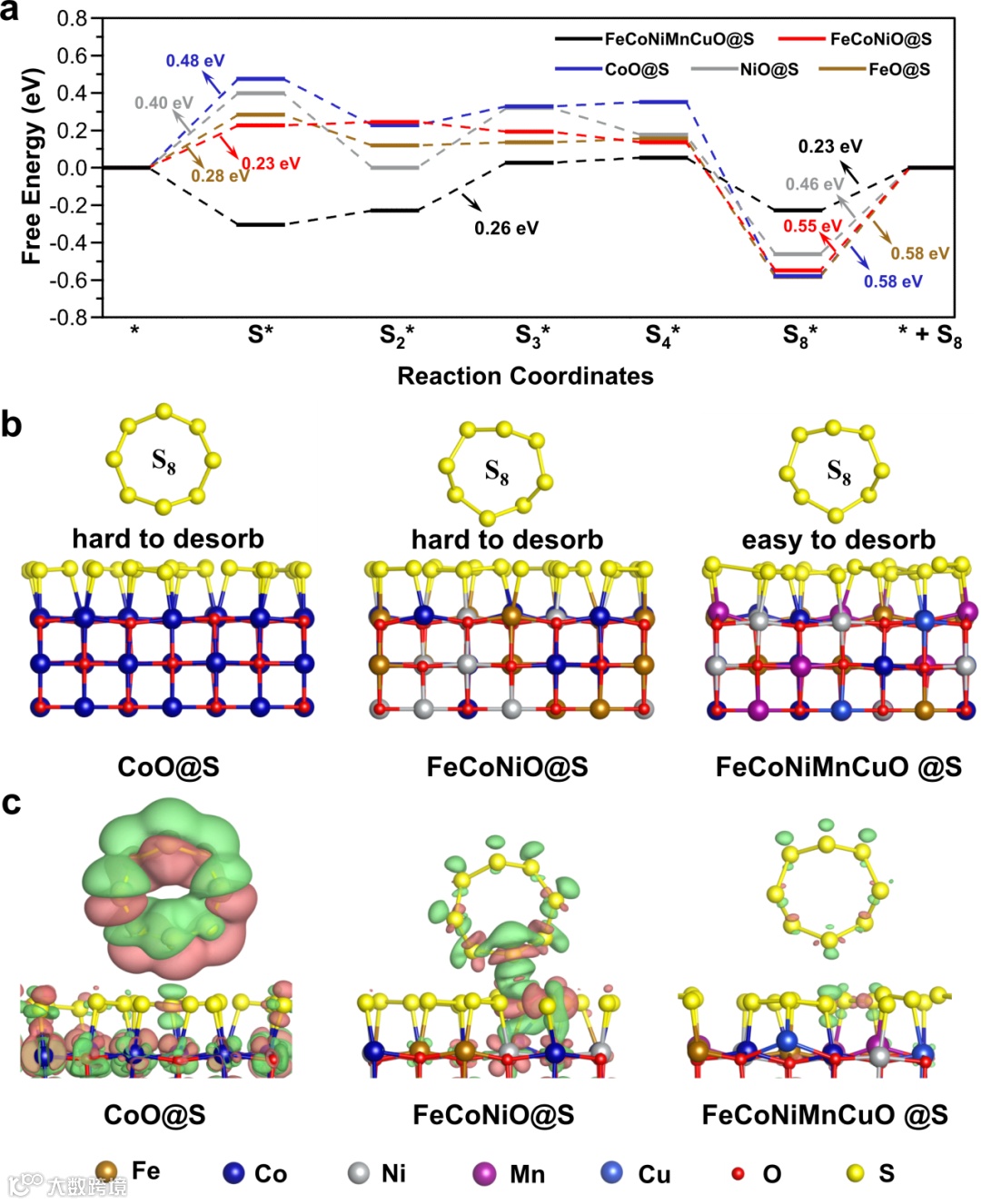 此外,文中密度泛函理论(DFT)计算表明各氧化物表面均具有强烈的硫亲和力,易发生表面硫富集,与原位同步辐射结论一致。理论平衡电位下的自由能计算表明:单一金属氧化物及三元金属氧化物的S8产物脱附困难,其自由能在0.46至0.58 eV之间(图4a,b),是决定性反应步骤(PDS)。而FeCoNiMnCuO@S作为HEO具有更强的内部电荷稳定性(图4c),其S8脱附自由能(0.23 eV)明显低于其它对比模型催化剂。这表明HEO的高熵效应提高了SOR活性,与实验结果一致。