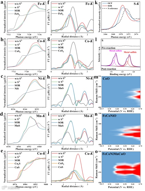 图3. a-e) FeCoNiMnCuO HEO纳米颗粒中的不同过渡金属在SOR过程中金属K边的原位XANES谱,以及f–j) k²加权原位FT-EXAFS谱。k) 催化剂在OCPS和SOR后测得的S K边准原位XANES谱。l) SOR前后高分辨率S 1s XPS谱。在m) CoO、n) FeCoNiO和o) FeCoNiMnCuO纳米颗粒催化剂上测得的2D原位拉曼光谱图。电解液:2 M Na2S+seawater