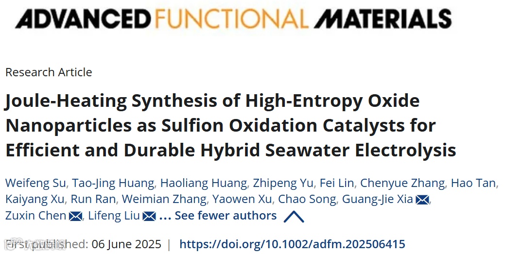 近日,来自松山湖材料实验室的刘利峰研究员与华南师范大学陈祖信副研究员、大湾区大学夏广杰研究员合作,在国际知名期刊Advanced Functional Materials上发表题为“Joule-Heating Synthesis of High-Entropy Oxide Nanoparticles as Sulfion Oxidation Catalysts for Efficient and Durable Hybrid Seawater Electrolysis”的文章。该文章通过焦耳热辅助制备高熵氧化物纳米颗粒并将其作为硫氧化催化剂实现了高效混合海水电解制氢,同时通过原位同步辐射及理论计算进一步研究了该催化剂在硫氧化时的反应机理。