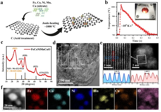 图1. a) FeCoNiMnCuO HEO NPs催化剂的合成示意图。b) 焦耳加热过程中温度随时间变化的曲线。c) FeCoNiMnCuO HEO催化剂的XRD图谱。d) FeCoNiMnCuO HEO催化剂的TEM图像。插图:显示FeCoNiMnCuO纳米颗粒的尺寸分布的直方图。e)垂直于(121)晶面投影的Cs校正STEM图像。f) HAADF-STEM图像和相应的FeCoNiMnCuO HEO催化剂的元素空间分布图。
