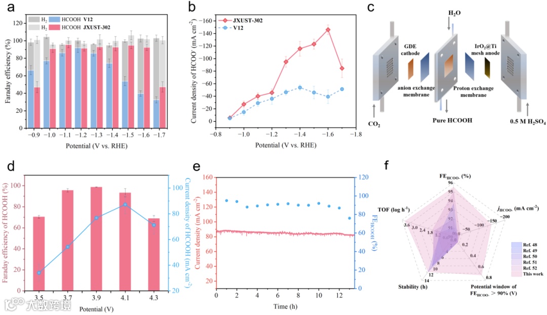 基于萘二酰亚胺类衍生物配体设计合成了一例Bi-MOFs材料(JXUST-302),该MOF具有七配位Bi节点、纳米级的孔道和71.3%的大孔隙率。与具有相似结构和孔隙率,但八配位的V12相比,JXUST-302的FEHCOO-最高可达95.5%,对应jHCOO-为-146.2 mA cm-2,并且能在700 mV的电势窗口中保持90%以上的FEHCOO-,表现出对HCOOH优异的催化性能。在固态电解质介导的膜电极电解池(MEA-SSE)装置中,JXUST-302的FEHCOOH最高可达98.8%,并且在3.9 ~ 4.1 V电势范围内保持90%以上的FEHCOOH,证实催化剂在工业生产纯HCOOH溶液的巨大潜力。