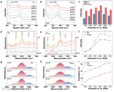 原位拉曼(SERS)显示 CuTEA表面CO中间体覆盖度更高(图 3a-c),原位红外(ATR-SEIRAS)证实其各个中间体更丰富且界面水结构更利于 K⁺脱水(图 3d-i)。