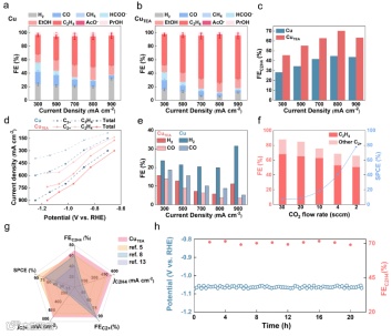 在酸性电解液中,CuTEA的C2H4法拉第效率和分电流密度显著高于 Cu(图 2a-c),在800 mA・cm-2时 C2+法拉第效率达 87.7%,乙烯达到70.2%,性能优于多数文献报道的催化剂(图 2g),且在长时间测试中稳定性良好(图 2h)。