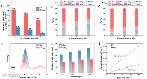 图 4. 反应机理研究。(a) 在不同浓度的 KCl 溶液(pH = 1)中,K+ 在 Cu 和 CuTEA 表面的吸附量比较。(b–c) 在 800 mA·cm-2 条件下,Cu (b) 和 CuTEA(c) 上不同产物的法拉第效率随 K+ 浓度变化的趋势图(KCl 溶液,pH = 1)。(d) 在 1.5 V 条件下,Cu 与 CuTEA 表面水分子的RDF。(e) 阴极与阳极之间不同电位下的氢键数量随电位的变化图。(f) Cu 与 CuTEA 上充电电流密度差值相对于扫描速率的变化曲线图。