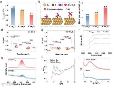 图 1. DFT 计算与表征分析。(a) 不同水合态 K+对 *CO 中间体吸附能的影响。(b) K⁺·2H2O(左)、K+·4H2O(中)和 K+·6H2O(右)存在时,*CO在Cu(111)表面吸附的模型示意图。(c) 不同水合态 K+对*CO 偶联形成*OCCO的吉布斯自由能变化的影响。(d–e) 在 Cu(111)表面存在一个(d)或两个(e)K+·2H2O 的情况下,*CO偶联为C2H4的吉布斯自由能变化路径图。(f) Cu与 CuTEA 的归一化 Cu K边XANES光谱。(g)Cu与CuTEA的 F 1s XPS光谱。(h) Nafion–Cu 与 Nafion–CuTEA的径向分布函数(RDF)。(i) Nafion 在 DMSO 中是否存在TEAOH 条件下的小角 X 射线散射(SAXS)曲线。