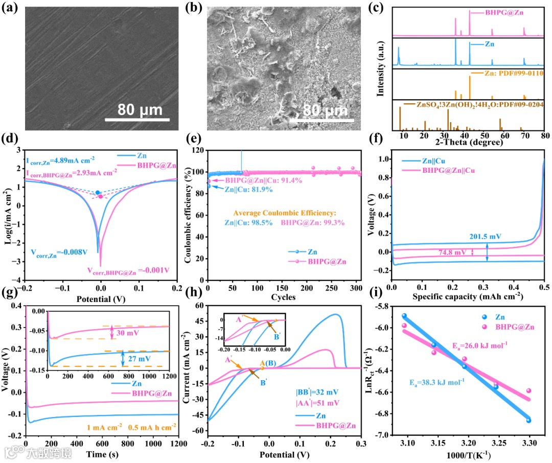 图2. (a)溶解于2 M硫酸锌中7天后的BHPG@Zn和(b)溶解于2 M硫酸锌中7天后的Zn箔电极的SEM图像;(c)溶解于2 M硫酸锌中7天后的BHPG@Zn和Zn的XRD分析;(d)BHPG@Zn和Zn的Tafel图;(e)在1.0 mA cm-2条件下,锌|铜和BHPG@Zn|铜电池中锌镀/剥离的库仑效率,0.5 mAh cm-2;(f)第10次循环时锌|铜和BHPG@Zn|铜电池的电压曲线;(g)基于锌|铜和BHPG@Zn|铜电池的锌阳极成核过电位;(h)锌和BHPG@Zn在铜箔上的成核循环伏安图;(i)通过不同温度下的阻抗测量计算出的BHPG@Zn和Zn的活化能。