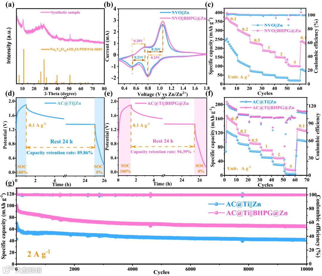 图5.(a)NVO的XRD图谱及Na2V6O16·nH2O标准XRD图谱(JCPDS编号16-0601),评估NVO||Zn和NVO||BHPG@Zn全电池的性能,(b)循环伏安曲线和(c)快速性能评估;(d)AC@Ti||Zn和(e)AC@Ti||BHPG@Zn自放电测试过程中的电压-时间曲线;(f)组装有AC@Ti||Zn和AC@Ti||BHPG@Zn的电容器的快速性能评估;(g)2 A g-1下的长循环性能。