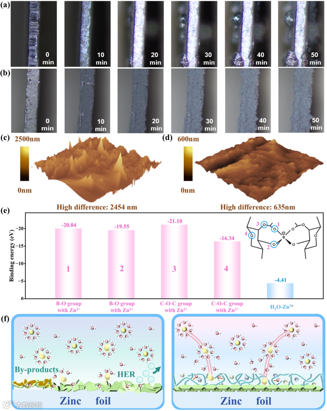 图3.操作光学显微镜拍摄的图像:(a)纯锌和(b)在2 mA cm⁻²电流密度下电沉积50 min后的BHPG@Zn电极;在2 mA cm⁻²电流密度下循环10次,容量为0.5 mAh cm⁻²的Zn||Zn和21 BHPG@Zn||BHPG@Zn对称电池:(c)纯锌阳极和(d) BHPG@Zn阳极的AFM图像;(e)Zn2+-H2O和Zn2+-BHPG的结合能;(f)Zn²⁺离子通过与BHPG耦合快速脱溶剂化的示意图。
