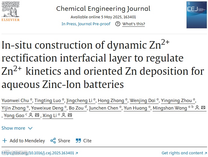 近日,西南石油大学的王明珊、李星教授在国际知名期刊Chemical Engineering Journal上发表题为“In-situ construction of dynamic Zn2+ rectification interfacial layer to regulate Zn2+ kinetics and oriented Zn deposition for aqueous Zinc-Ion batteries”的观点文章。通过在Zn阳极上原位旋涂和交联亲水性硼砂改性羟丙基瓜尔胶,构建了动态Zn2+整流界面层(DRIL),旨在提升锌阳极的界面稳定性和锌离子电池的循环稳定性。