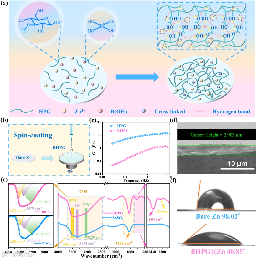 图1. (a)形成的BHPG@Zn界面示意图;(b)BHPG@Zn旋涂工艺示意图;(c)BHPG溶液和HPG溶液的损耗模量(G‘’)随频率变化曲线;(d)旋涂并干燥后的BHPG@Zn阳极截面SEM图像;(e)2M ZnSO₄电解质和BHPG的FTIR光谱;(f)空白Zn与BHPG@Zn电极在2M硫酸锌电解质中的接触角。