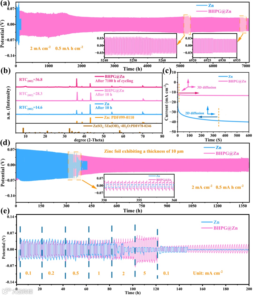图4. (a)在2 mA cm⁻²和0.5 mAh cm⁻²条件下,BHPG@Zn||BHPG@Zn和Zn||Zn对称电池的循环稳定性;(b)在2 mA cm⁻²和0.5 mAh cm⁻²条件下,裸锌负极和BHPG@Zn负极10小时后的XRD图,以及在2 mA cm⁻²和0.5 mAh cm⁻²条件下循环7100小时后的BHPG@Zn负极的XRD图;(c)BHPG@Zn和裸锌电极的CA曲线;(d)使用厚度为10 μm的锌箔作为基材,在2 mA cm⁻²和0.5 mAh cm⁻²条件下,26个BHPG@Zn||BHPG@Zn和Zn||Zn对称电池的循环稳定性;(e)BHPG@Zn||BHPG@Zn和Zn||Zn对称电池的倍率性能。