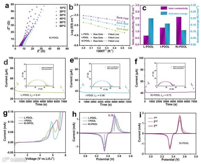 图3. a) 使用 KI-PDOL 电解质的电池在不同温度下的EIS图谱。b) 不同温度下的离子电导率。c) 离子电导率和活化能。d–f) 使用 L-PDOL、I-PDOL 和 KI-PDOL 的电池的锂离子迁移数。g) L-PDOL、I-PDOL 和 KI-PDOL 的LSV曲线。h) L-PDOL、I-PDOL 和 KI-PDOL 的 Li/LFP 电池的CV曲线。i) 使用 KI-PDOL 的 Li/LFP 电池的前三次循环的CV曲线。