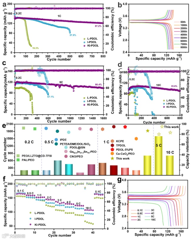 为了探究复合固体电解质对金属锂阳极的影响,采用Li/Li 对称电池进行了锂沉积/剥离循环实验。采用 KI-PDOL 电解质组装的 Li/Li 对称电池表现出优异的循环稳定性,在 1400 小时内稳定运行,未出现极化不稳定或短路现象。相比之下,使用 L-PDOL 和 I-PDOL 电解质的电池分别在运行 200 小时和 700 小时后电压显著升高。循环后的EIS测试表明,KI-PDOL具有更低的界面阻抗与电荷转移阻抗,反映出更稳定的电极电解质界面和更快的电荷转移过程。SEM图像显示L-PDOL和I-PDOL存在明显的裂纹和枝晶,而KI-PDOL则呈现致密均匀的锂沉积。为进一步评估其电化学性能,我们组装了Li/LFP全电池进行测试。采用KI-PDOL的电池在1C稳定循环800周后,仍保持121.5 mAh g⁻¹ 的容量,容量保持率达87.2%。即使在10C高倍率下,仍能稳定循环800周并保持83.6%的容量保持率。展现出优异的循环稳定性。