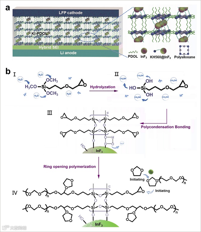 近日,南开大学李国然教授团队在国际知名期刊Advanced Functional Materials上发表题为“Organic–Inorganic Covalently Crosslinked Electrolyte Fabricated In Situ via Multifunctional Fillers for High-Performance Solid-State Lithium Metal Batteries”的最新研究。该研究通过用KH560功能化的InF₃填料(KH560@InF₃)与DOL开环共聚合反应原位制备了一种有机-无机共价交联电解质(KI-PDOL),综合提升电解质机械性能、离子传输和界面稳定性。