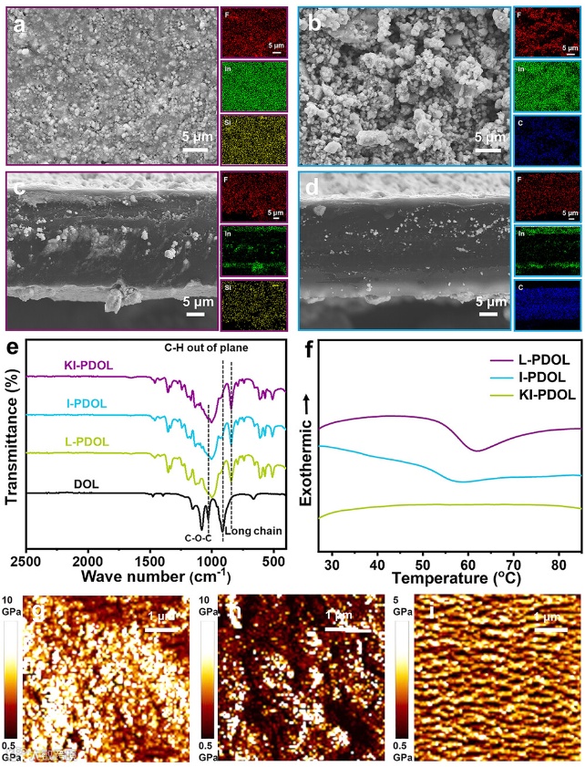 图2. a、c)KI-PDOL 和 b、d)I-PDOL 的SEM图像。e)L-PDOL、I-PDOL、KI-PDOL 和 DOL 的FTIR光谱。f)L-PDOL、I-PDOL 和 KI-PDOL 的DSC曲线。g)KI-PDOL、h)I-PDOL 和 i)L-PDOL的AFM图像。