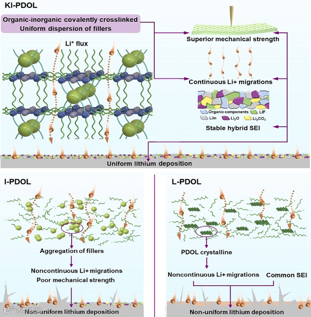SEM图像显示,KI-PDOL中填料分散均匀,而I-PDOL中则表现出明显的填料团聚,表明KH560能够提升无机填料与聚合物基质的相容性,从而促进了填料在聚合物基体中的分散性。此外,由于均匀分散的无机填料与有机-无机共价交联结构,KI-PDOL表现出更优异的机械性能,这有利于抑制锂枝晶的生长。