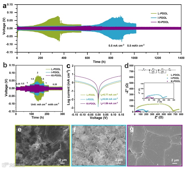 图4. a) L-PDOL、I-PDOL 和 KI-PDOL 组装的 Li/Li 对称电池锂沉积/剥离曲线。b) L-PDOL、I-PDOL 和 KI-PDOL 组装的 Li/Li 对称电池在不同电流密度下的倍率性能。c) L-PDOL、I-PDOL 和 KI-PDOL的Tafel曲线。d) 以 L-PDOL、I-PDOL 和 KI-PDOL 组装的循环 Li/Li 对称电池的EIS谱图。e) L-PDOL、f) I-PDOL 和 g) KI-PDOL 组装的 Li/LFP 电池循环后的锂金属SEM图像。