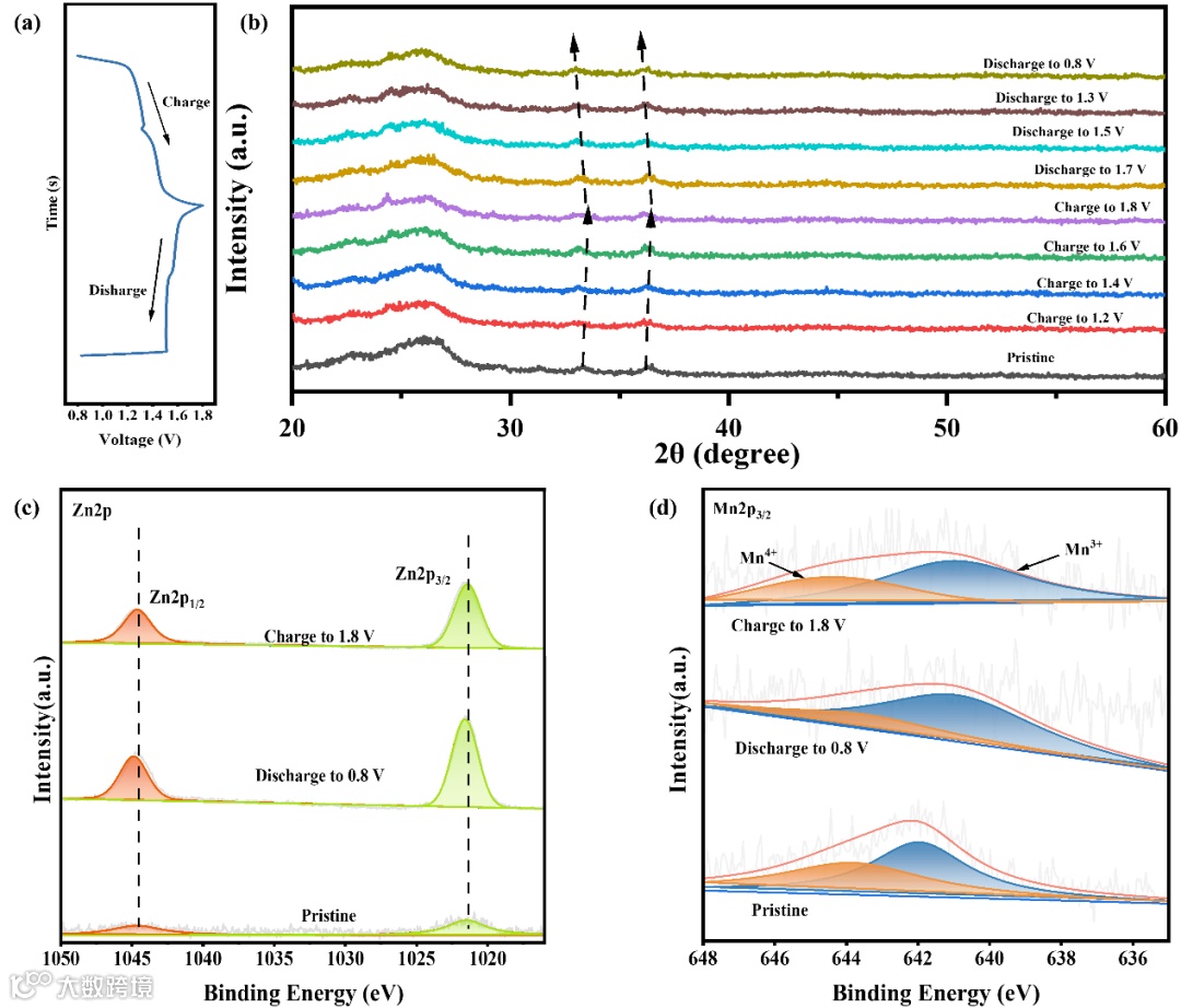 图8 (a) ZMO/CNT-F 在 0.2 A·g⁻¹ 下的充放电曲线;(b) 不同充放电状态下 ZMO/CNT-F 的原位后(ex situ)XRD 图谱;(c) 选定充放电状态下 ZMO/CNT-F 电极的原位后 Zn 2p XPS 光谱;(d) 不同充放电状态下 ZMO/CNT-F 电极的原位后 Mn 2p₃/₂ XPS 光谱。