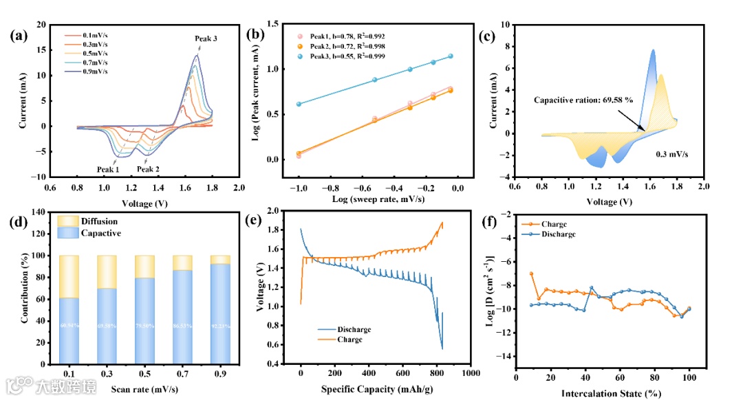 图7 (a) 0.1–0.9 mV·s⁻¹ 不同扫描速率下 ZMO/CNT-F 的 CV 曲线;(b) 各氧化还原峰的 log(i)–log(v) 拟合;(c) 0.3 mV·s⁻¹ 下的 CV 曲线及赝电容贡献高亮;(d) 不同扫描速率下赝电容与扩散控制贡献;(e) ZMO/CNT-F 电极的 GITT 曲线;(f) ZMO/CNT-F 在充放电过程中的 Zn²⁺扩散系数。