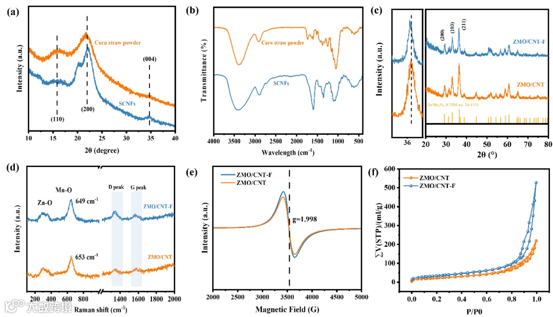 图2 (a) 玉米秸秆与其制得的纤维素纳米纤维(SCNFs)的 XRD 图谱;(b) 玉米秸秆与 SCNFs 的 FTIR 光谱;(c) ZMO/CNT 与 ZMO/CNT-F 的 XRD 图谱;(d) ZMO/CNT 与 ZMO/CNT-F 的 Raman 光谱;(e) ZMO/CNT 与 ZMO/CNT-F 的 EPR 光谱;(f) ZMO/CNT 与 ZMO/CNT-F 的 N₂ 吸附–脱附等温线。