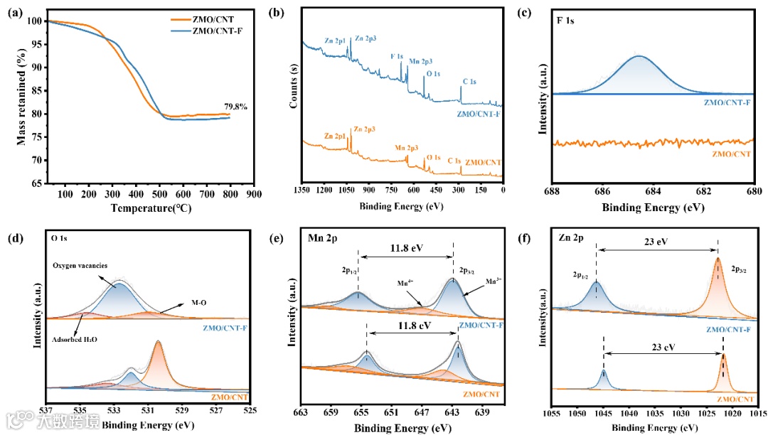 图3 (a) ZMO/CNT 与 ZMO/CNT-F 的 TGA 曲线;(b) ZMO/CNT 与 ZMO/CNT-F 的全谱 XPS;(c) ZMO/CNT 与 ZMO/CNT-F 的高分辨 F 1s 光谱;(d) ZMO/CNT 与 ZMO/CNT-F 的高分辨 O 1s 光谱;(e) ZMO/CNT 与 ZMO/CNT-F 的高分辨 Mn 2p 光谱;(f) ZMO/CNT 与 ZMO/CNT-F 的高分辨 Zn 2p 光谱。