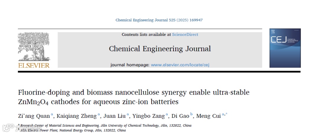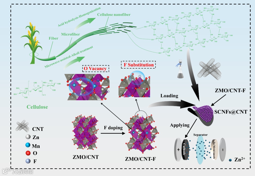 吉林化工大学崔萌副教授团队在 CEJ 发表观点性研究:提出“氟掺杂(缺陷工程)+ 生物质纳米纤维增强(结构工程)”的双向协同思路,系统提升 ZMO 正极的结构稳定性与传输动力学。工作通过F 掺杂诱导氧空位与能带调控,并以秸秆来源的纤维素纳米纤维(SCNFs)@碳纳米管(CNT)构建柔性导电骨架,实现高比容量、优异倍率与超长循环寿命。