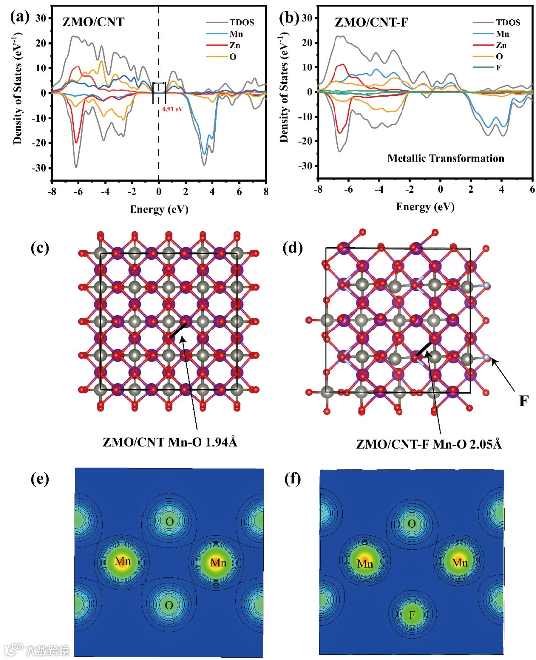 图4 (a–b) ZMO/CNT 与 ZMO/CNT-F 的总态密度与分态密度(TDOS 与 PDOS);(c–d) ZMO/CNT 与 ZMO/CNT-F 的晶体结构模型;(e–f) ZMO/CNT 与 ZMO/CNT-F 的电荷密度分布。
