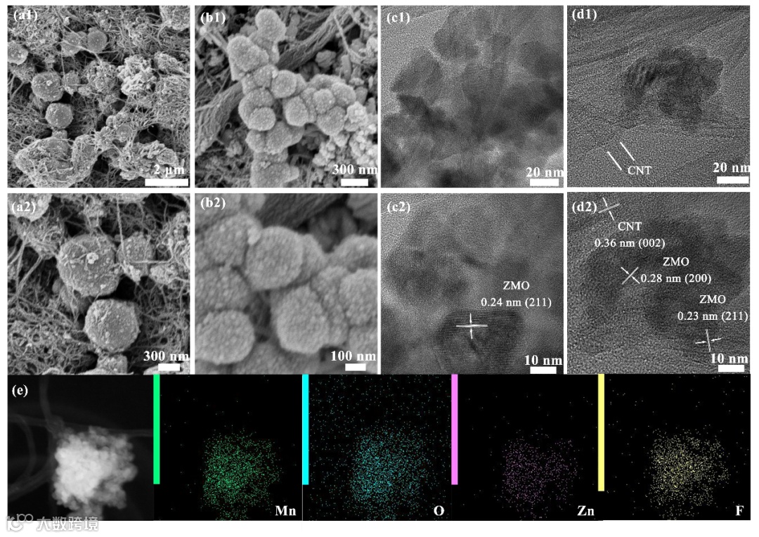 图5 (a1, a2) 不同放大倍数下 ZMO/CNT 的 SEM 图像;(b1, b2) 不同放大倍数下 ZMO/CNT-F 的 SEM 图像;(c1, c2) ZMO/CNT 的 TEM 与 HRTEM 图像;(d1, d2) ZMO/CNT-F 的 TEM 与 HRTEM 图像;(e) ZMO/CNT-F 的元素分布(映射)图。