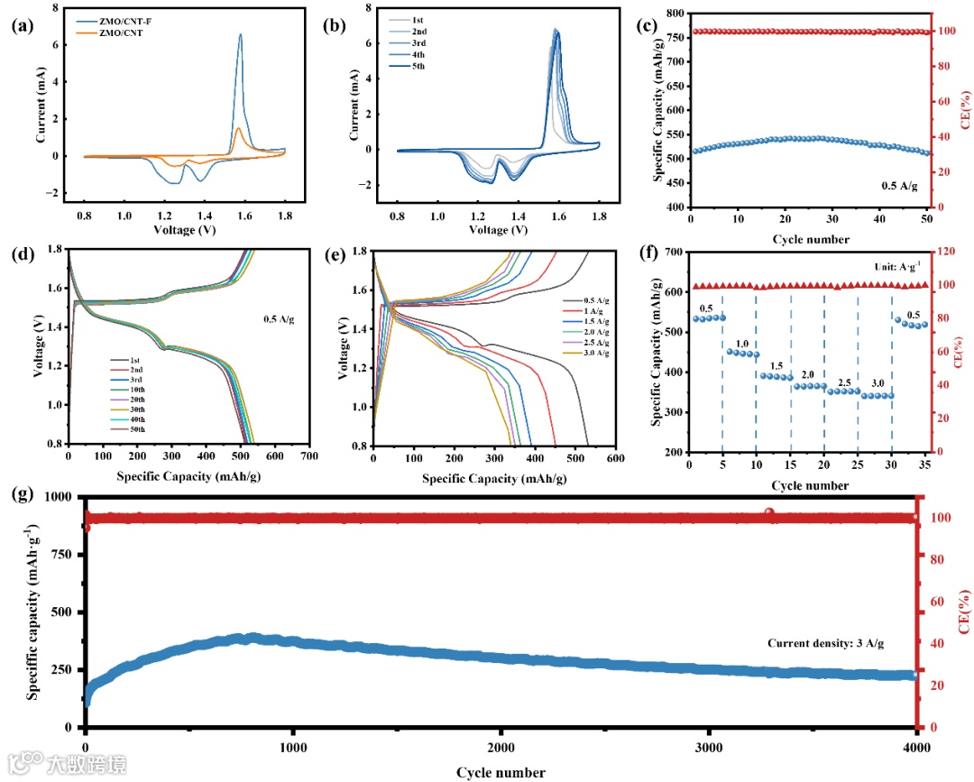 图6 (a) 扫描速率 0.2 mV·s⁻¹ 下 ZMO/CNT 与 ZMO/CNT-F 的 CV 曲线;(b) ZMO/CNT-F 在 0.2 mV·s⁻¹ 下前 5 圈的 CV 曲线;(c) 不同电流密度下 ZMO/CNT-F 的 GCD 曲线;(d) ZMO/CNT-F 在 0.5 A·g⁻¹ 下的长循环性能;(e) ZMO/CNT-F 在 0.5 A·g⁻¹ 下不同循环次数的 GCD 曲线;(f) ZMO/CNT-F 的倍率性能;(g) ZMO/CNT-F 在 3 A·g⁻¹ 下的长循环稳定性。