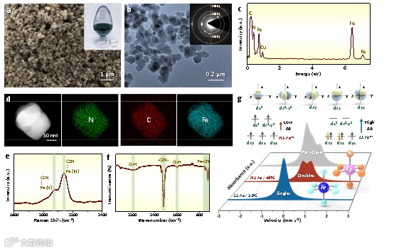图2:a-g)FeHCF正极的结构表征及拉曼/红外/穆斯堡尔谱测试结果(g中插图为FeHCF中高/低自旋铁的电子态示意图)。