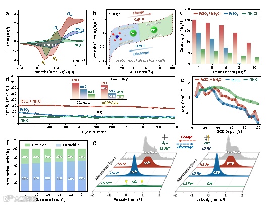 图3:a-e)FeHCF正极在不同电解液中的半电池测试及其g)在满充/满放状态下的室温57Fe穆斯堡尔谱。