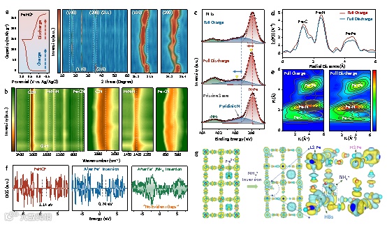图4:a-g)FeHCF正极在FeSO4+NH4Cl电解液体系充放电过程中的原位测试分析、XPS谱图、EXAFS谱图、小波变换谱图,以及在不同阳离子嵌入阶段下的态密度图和差分电荷密度图。