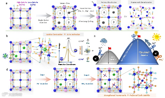 图1:a)传统Fe2+单离子(脱)嵌引发FeHCF正极结构坍塌示意图;b-d)Fe2+嵌入诱导FeHCF晶格收缩/激活LS Fe,以及NH4+协同共嵌入实现FeHCF正极比容量和循环寿命倍增的示意图。