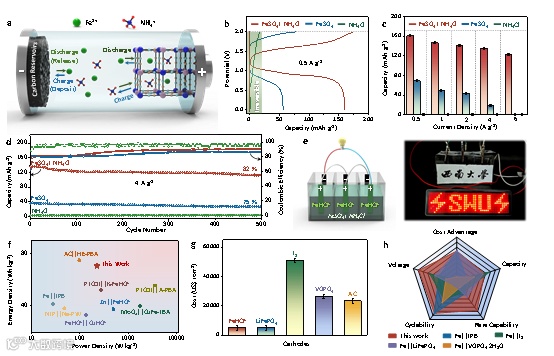 图5:a-h)全电池结构示意图、不同电解液中的全电池性能对比、电池组驱动LED灯板照片、与其它PBAs正极体系的能量密度/功率密度对比图、不同正极材料的成本对比、与其它主流铁离子电池的参数对比图。