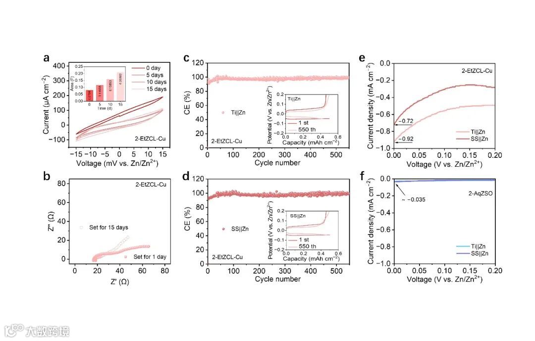 持续的自发Zn/Cu合金化-去合金化过程能够在非铜基底上原位构建具有高亲锌性的合金界面,进而有效提升锌沉积的稳定性和可逆性。对于含2-EtZCL-Cu的Ti||Zn和SS||Zn半电池,它们的库伦效率在550次循环后仍保持稳定,性能接近Cu||Zn半电池体系。CV在负扫过程中,2-EtZCL-Cu体系出现明显的欠电位沉积电流响应,相对2M ZnSO4(2-AqZSO)体系增强超过10倍,证实了自发置换行为的存在。