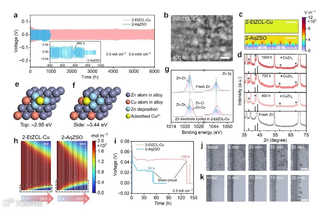 基于2-EtZCL-Cu的锌对称电池在0.5 mA cm–2条件下可实现超过6000 h的超长稳定循环,远优于传统的2-AqZSO电解质(892 h)。循环后电极表面呈现平坦、致密的形貌,不同循环时间后表面的XRD检测均发现低强度CuZn5合金相信号,证实了电极表面持续暴露的亲锌性Cu位点。有限元模拟证实,2-EtZCL-Cu电解质中不易在电极界面产生离子浓度梯度,而在该体系中发展形成的电极形貌也会使表面电场分布更均匀,可有效延缓锌枝晶的形成,在实时监测的光学图像中直观的验证了这些结论。另外,DFT计算从机理层面揭示,Zn/Cu共沉积条件下Cu离子在锌沉积侧位点表现出极强的吸附能(–3.44 eV),远高于Zn离子在相同位置的吸附能(–1.29 eV),从而可有效锚定Cu离子。与此同时,界面吸附的Cu-Zn离子对有更强的相互作用,可引导Zn2+沿Cu位点优先沉积,限制其横向扩散,进而促进锌的均匀、致密沉积。