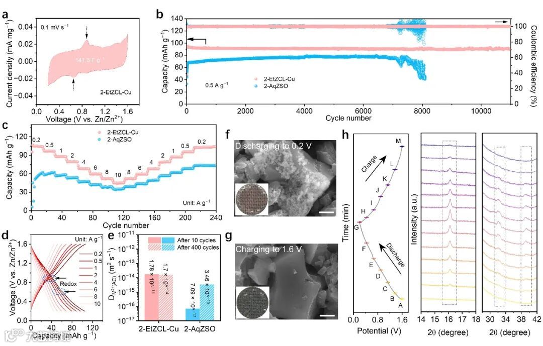 采用2-EtZCL-Cu电解质和活性炭(AC/CFC)正极组装全电池,测得的CV曲线中出现明显的氧化还原峰,对应Cu⁺/Cu²⁺氧化还原对,其贡献了额外的容量。2-EtZCL-Cu全电池在0.5 A g–1下经过10,000次循环后,仍能保持90.05 mAh g–1的比容量,远超2-AqZSO电解质全电池。乙醇溶剂提供的热力学稳定环境和高浓度Cl–离子,有效稳定了Cu+,形成可逆吸附-脱附的[CuCl2]–,抑制Cu+歧化,这是2-EtZCL-Cu全电池实现高比容量和高稳定性的关键。