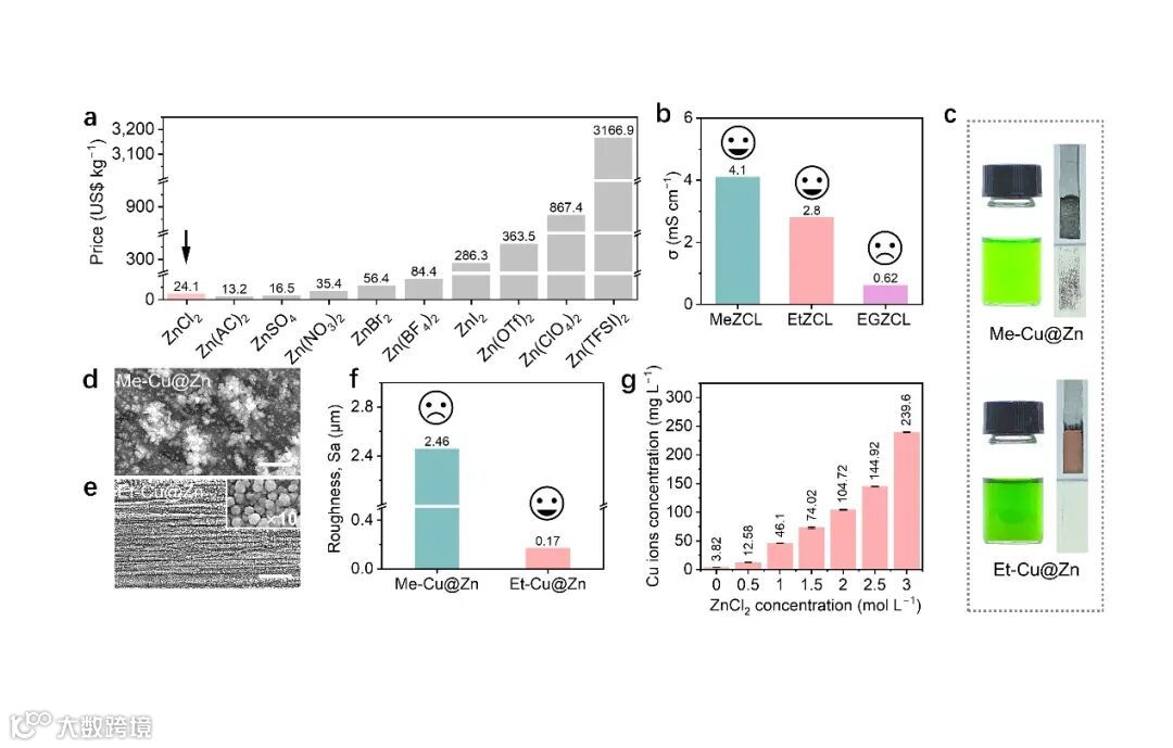 本研究中,氯化锌被选为最优锌盐,因其既能满足通过络合驱动Cu(OH)2溶解所需的Cl–,又兼顾经济性。乙醇作为最优溶剂,因其兼具抑制ZnCl2水解、实现电解质(2 M)适中的电导率(2.8 mS cm–1)、可稳定的铜沉积以及具有高的ZnCl2溶解度(> 3 M)。