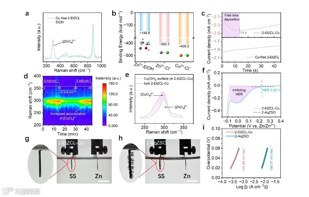 要点二:揭示乙醇基电解质独特的[ZnCl4]2–溶剂化结构、Cu2+诱导的动态界面调控及其电化学性能