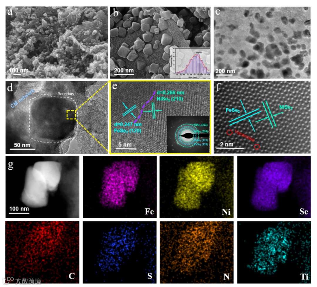 利用扫描电子显微镜(SEM)和透射电子显微镜(TEM)对材料结构进行了详细的表征。SEM和TEM图像表明硒化物纳米颗粒继承了普鲁士蓝类似物的立方结构,并均匀的嵌在CM网络中。高分辨透射电镜图像中能够清晰地观察到在FeSe2和NiSe2之间形成的异质边界。进一步采用高角度环形暗场扫描透射电镜(HAADF-STEM)对异质界面进行可视化。图像显示了两种不同的亮点簇(分别对应于 FeSe2和 NiSe2)和一些可见的原子空位。根据公式 计算得出FeSe2(120)晶面和NiSe2(210)晶面之间的晶格失配计算为7.69%,表明在两种硒化物相之间形成的是半共格界面。
