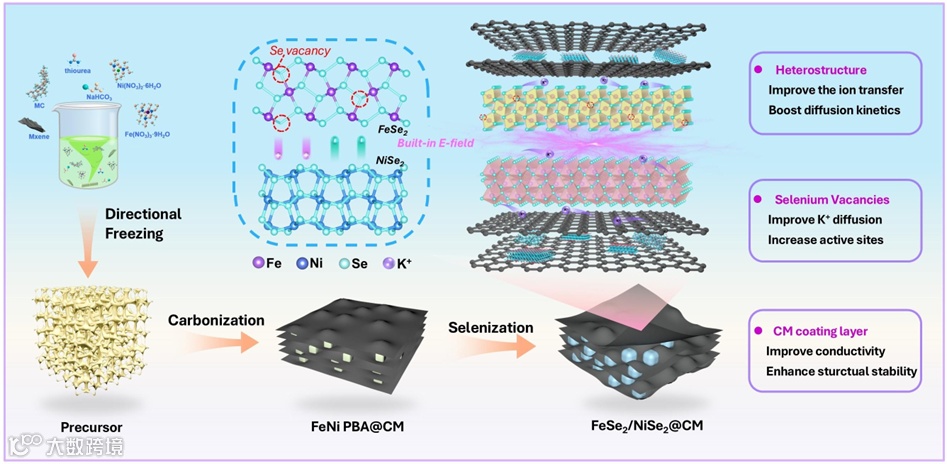 近日,近日,中国海洋大学王焕磊教授在国际知名期刊Small上发表题为“Co-Construction of Selenium Vacancy and Heterogeneous Structure in FeSe2/NiSe2to Induce Fast Ion Diffusion Kinetics for Potassium-Ion Batteries”的研究论文。该研究中设计并合成了具有空位和异质结构共存特点并嵌在掺杂碳和MXene组成的网络中的双金属硒化物复合材料(FeSe2/NiSe2@CM),并展现出优异的储钾性能。此外,异质结构和硒空位的协同优化作用在提升电化学性能方面的潜在机制被揭示。值得注意的是,该研究提出了一种异质结构协同空位工程的策略,这一旨在有效提升钾离子电池电化学性能的策略,为负极材料的战略性调控提供了新思路。