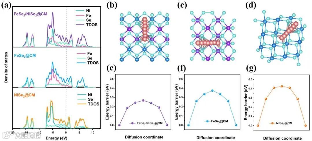 密度泛函数理论(DFT)计算表明,与FeSe2@CM和NiSe2@CM相比,FeSe2/NiSe2@CM在费米能级附近表现出增加的电子离域,这主要归因于异质界面工程产生的内置电场。这表明异质界面的形成增强了导电性并促进了更快的反应动力学。另外,对比单金属硒化物复合材料,FeSe2/NiSe2@CM具有最低的迁移能垒,表明异质界面的形成大大降低了扩散势垒,从而促进了更快速的K+传输。
