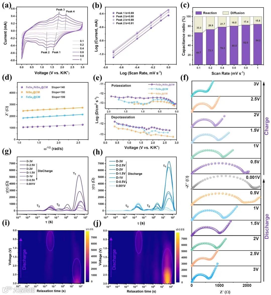 以不同扫速进行循环伏安(CV)测试继而计算相应的反应控制占比,并进一步通过电化学阻抗(EIS)和恒电流间歇(GITT)测试计算钾离子扩散系数。数据结果表明,FeSe2/NiSe2@CM的反应控制占比均大于50%,表明了其反应控制主导的过程。此外,FeSe2/NiSe2@CM展现出更高的钾离子扩散系数,表明异质结构的形成和硒空位的引入协同增强了K+的传输动力学。原位EIS以及弛豫时间分布(DRT)分析进一步揭示了异质结构和硒空位的协同作用使FeSe2/NiSe2@CM具有更快的电荷转移动力学。