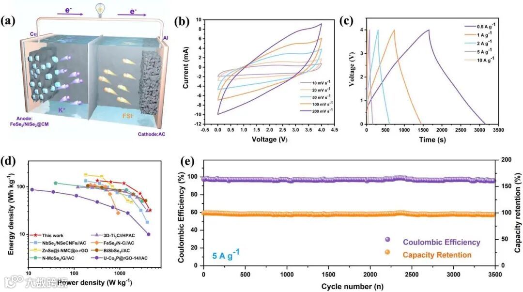 图8. FeSe2/NiSe2@CM在钾离子混合电容器中的性能测试