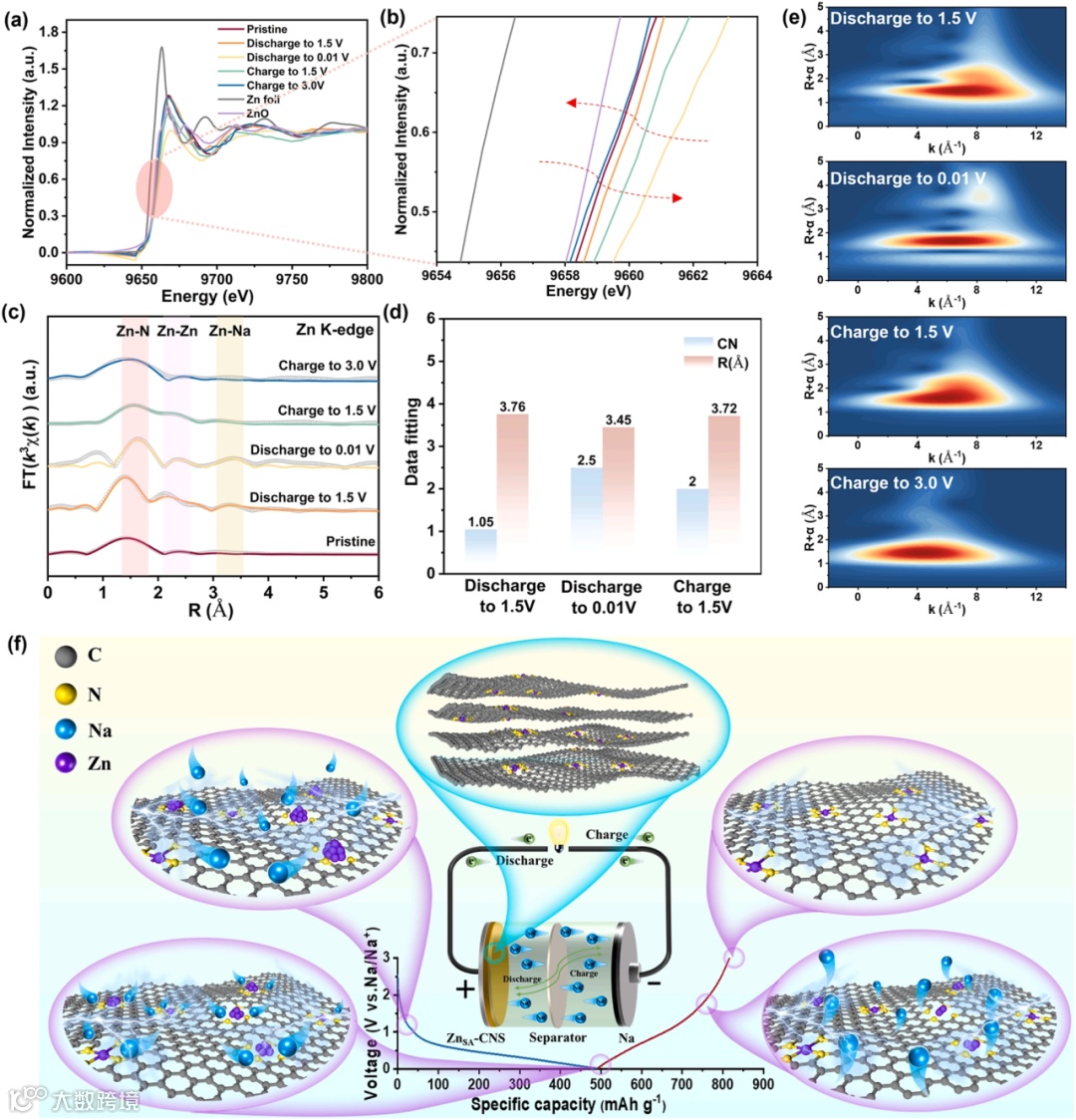 (a)非原位下归一化XANES光谱,(b)近边吸收位置的局部放大图(c)不同操作电位下Zn K边的FT-EXAFS拟合光谱。(d)充电和放电过程中配位数和键长的变化趋势。(e)不同工作状态下的小波变换图。(f)反应过程中动态结构演变的示意图。